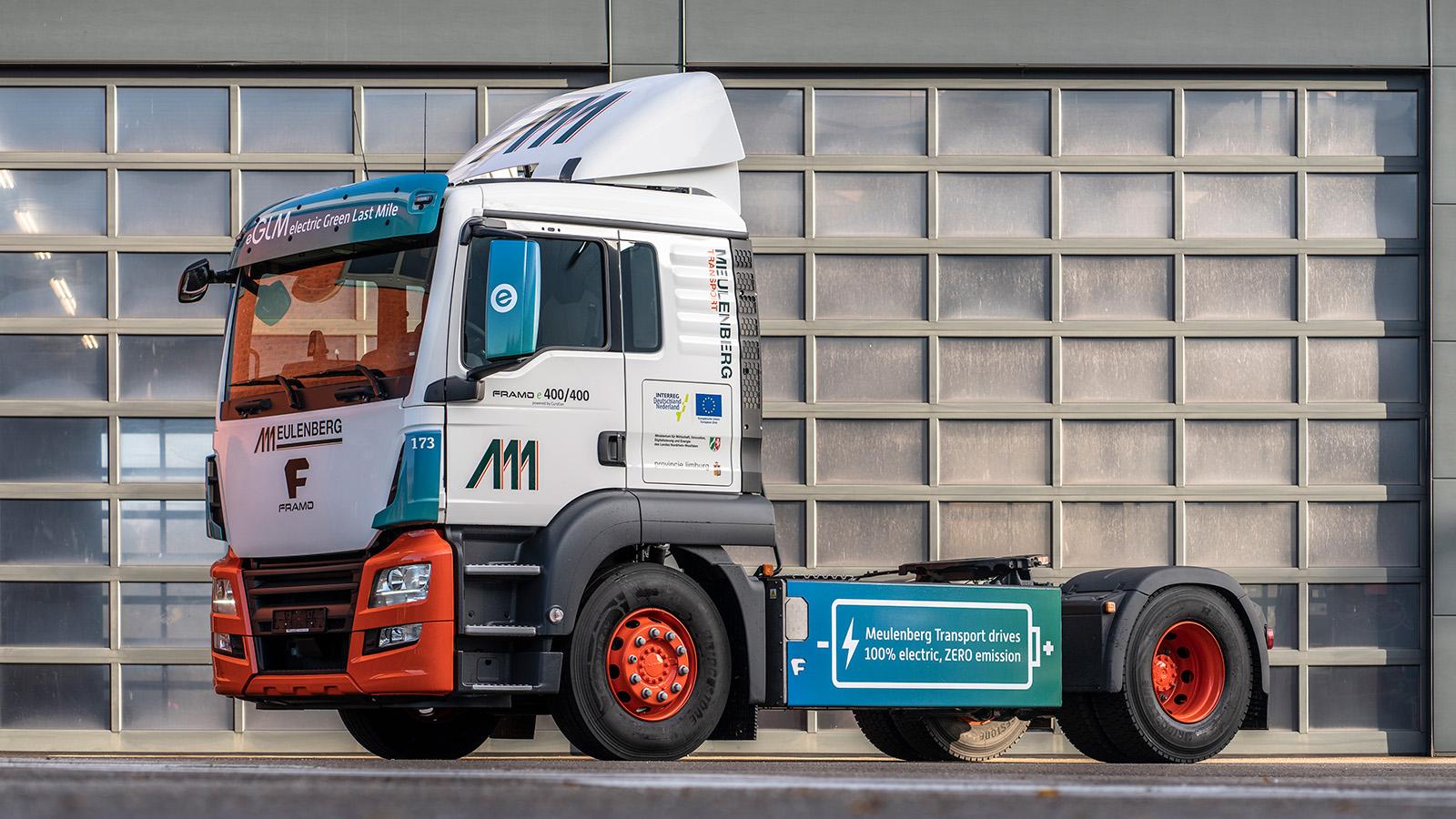 Binnen het eGLM-project is getest met uiteindelijk vier elektrische 40/44 ton trucks van het Duitse merk Framo. Dit Duitse merk bouwt op basis van MAN-trucks bestaande diesel voertuigen om en voorziet deze vrachtauto’s van een volledig elektrische aandrijflijn. De meerderheid van de afstanden die de deelnemende bedrijven in de regio afleggen vallen binnen 50 kilometer enkele reis. De actieradius van de elektrische truck bedraagt 150 kilometer met een batterijpakket dat beschikt over een netto capaciteit van 345 kWh. Het standaard vermogen ligt op 400 kW, zo’n 540 pk. Het piekvermogen van het accupakket ligt op 475 kW, goed voor 640 pk met een trekkracht van 11.000 Nm.